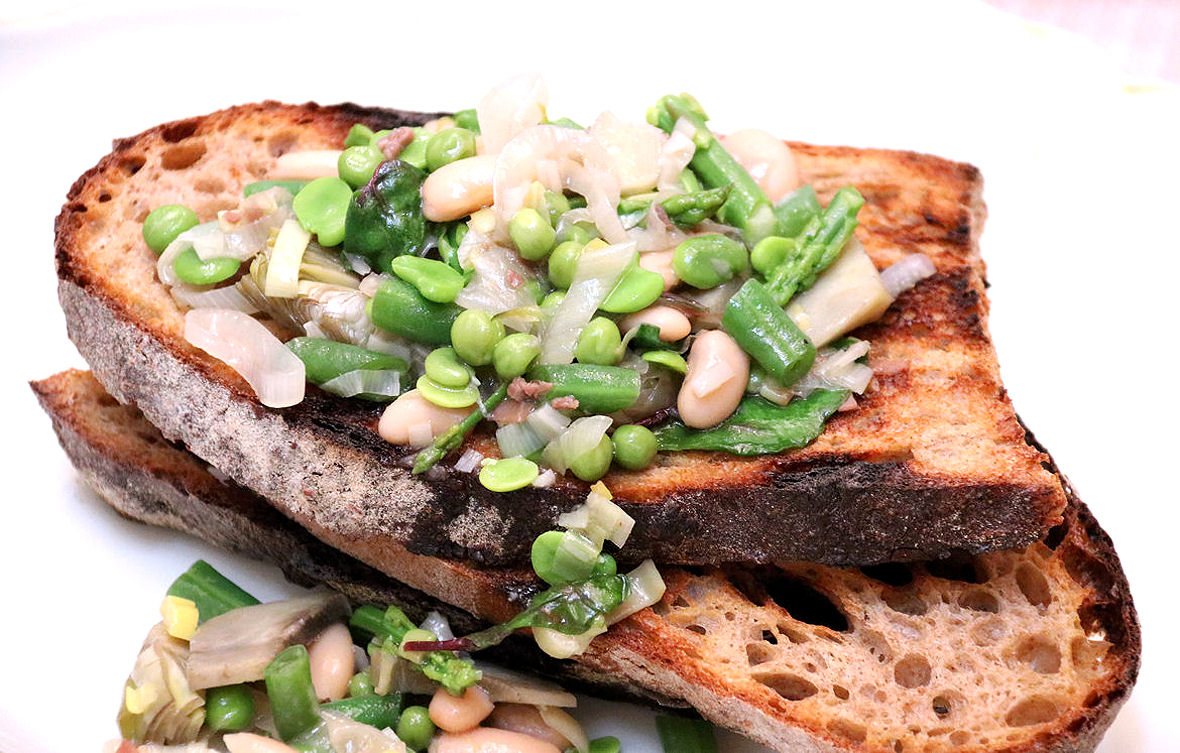 Spring Vegetable Ragù is perfect with toast or Italian-style toast called crostini. Combine the classic ragù technique of making soffritto with your favorite edible symbols of spring – artichokes, asparagus, fava or broad beans, green string beans, peas, leafy greens, and spring onions or scallions. Braise briefly to maintain their flavor and cheery green color.