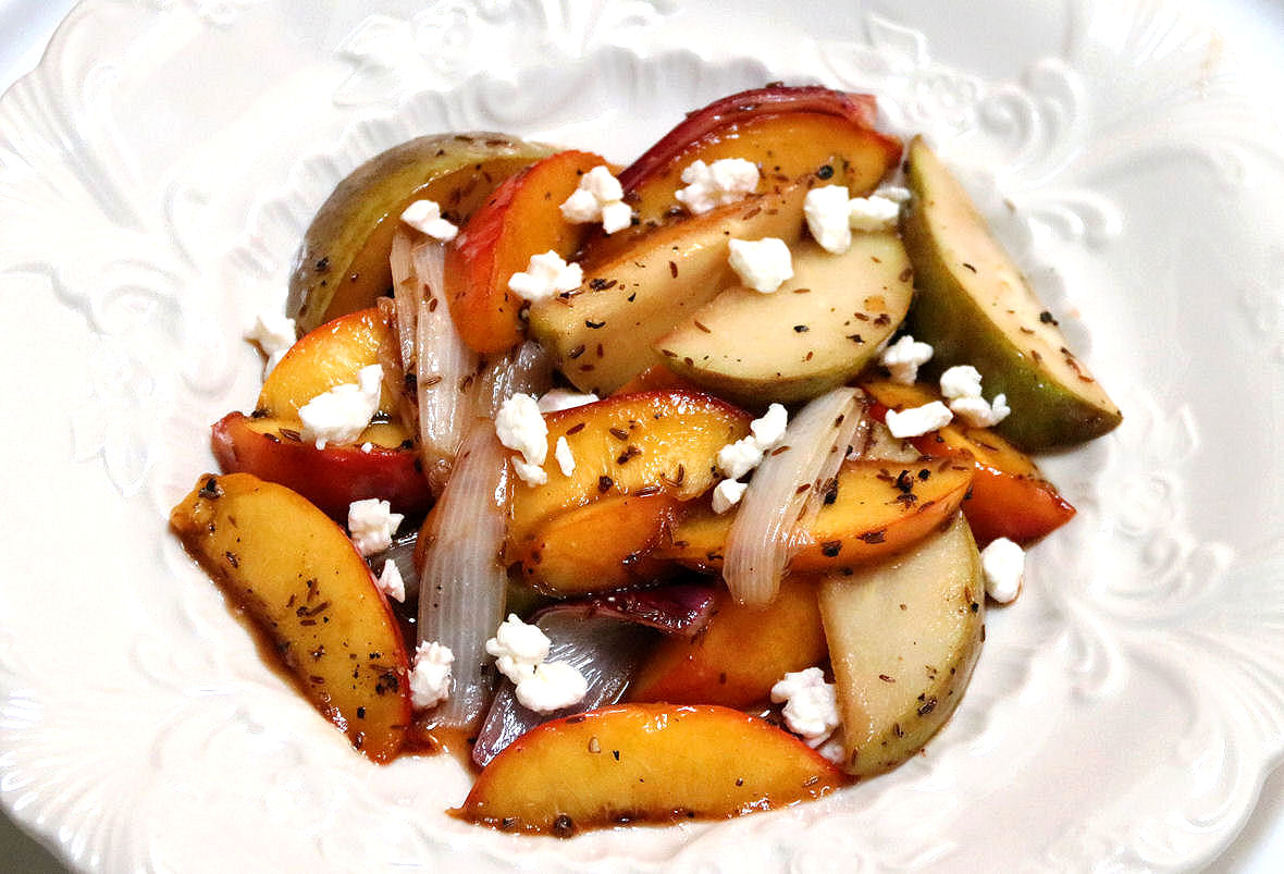 Plating: Arrange the sauteed pears, nectarines, and onion mix on plates. Sprinkle Feta crumbles over then serve warm or at room temperature.