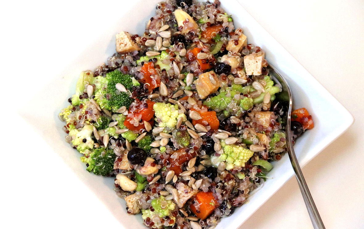 Romanesco and Broccoli Salad with Quinoa, Cashews, Blueberries, Tofu, and Roasted Carrots or Sweet Potato is a marvelous health salad. It is as satisfying and delicious as it is nutritious.