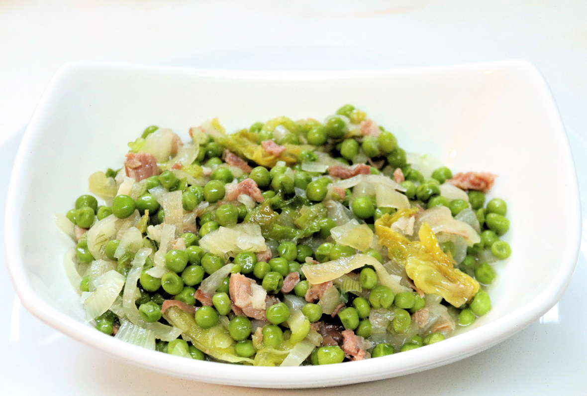 A classic Roman specialty, Peas and Prosciutto is one of Spring's highlights because the petite peas of Roma are famous for their sweetness. With only three main ingredients – peas, prosciutto crudo, and onions, this dish is very easy to make. If you happen to find beautiful white spring onions, be sure to include them instead of regular onions. Thinly slice their white bulbs with light green stems, saving the dark green part at the top of the stems for another use. In Italy, we love combining peas with lettuce because it is so refreshing, so a few handfuls are added to this signature dish. I enjoy using delicate butter lettuce, but choose any lettuce whether it is crunchy Romaine, or smooth tender Bibb, Cobb, or Boston, as long as it is mildly sweet to complement the natural sweetness of the dish.