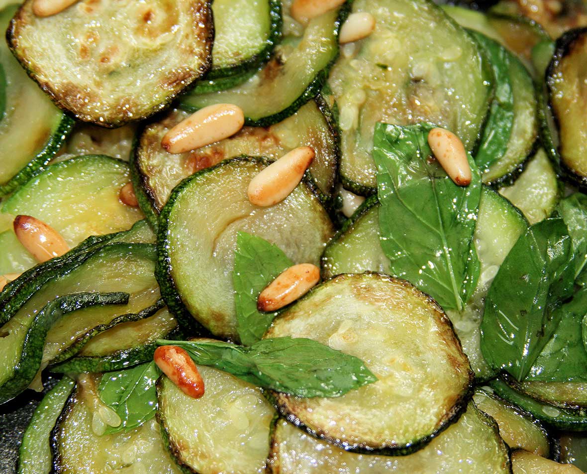 With gardens and markets overflowing with summer's vegetables, here is an Italian zucchini recipe that is sure to please. Make fried zucchini without batter or flour. Frying zucchini, especially when it is young and fresh, needs no coating. Simply fry until its edges are barely crisp, and drain. Then briefly saute with garlic, pine nuts, chili pepper, and toss with fresh mint and basil leaves. In Italy, we love this with pasta. It also tastes great served as a side dish, or as a bed for grilled fish, meat, or poultry, or tossed with your favorite grain making a light, satisfying salad.