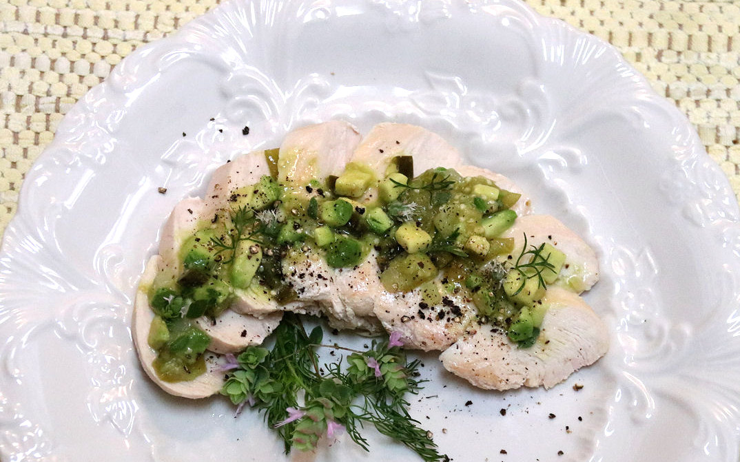 Quick and easy, Chicken Breast with Avocado-Tomatillo Sauce and Oregano Blossoms is a low-cal dish. Lovely to look at, too. With the sweet-spicy-tart sauce, a simple chicken breast becomes a main dish worthy of a restaurant. For even faster prep, serve this sauce with prepared roast or rotisserie chicken you purchased. You do not have to cook everything from scratch to savor a chef's meal at home. (Although you made it yourself, of course!)