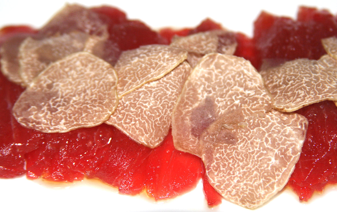 Thinly slice the raw tuna and arrange on serving plates. Brush with extra-virgin olive oil – very lightly – just so it barely glistens and remains moist as in the photo. Sprinkle a few grains of coarse sea salt on top. Shave fresh white truffles over the tuna carpaccio. Inhale the intoxicating aroma. Savor every bite.