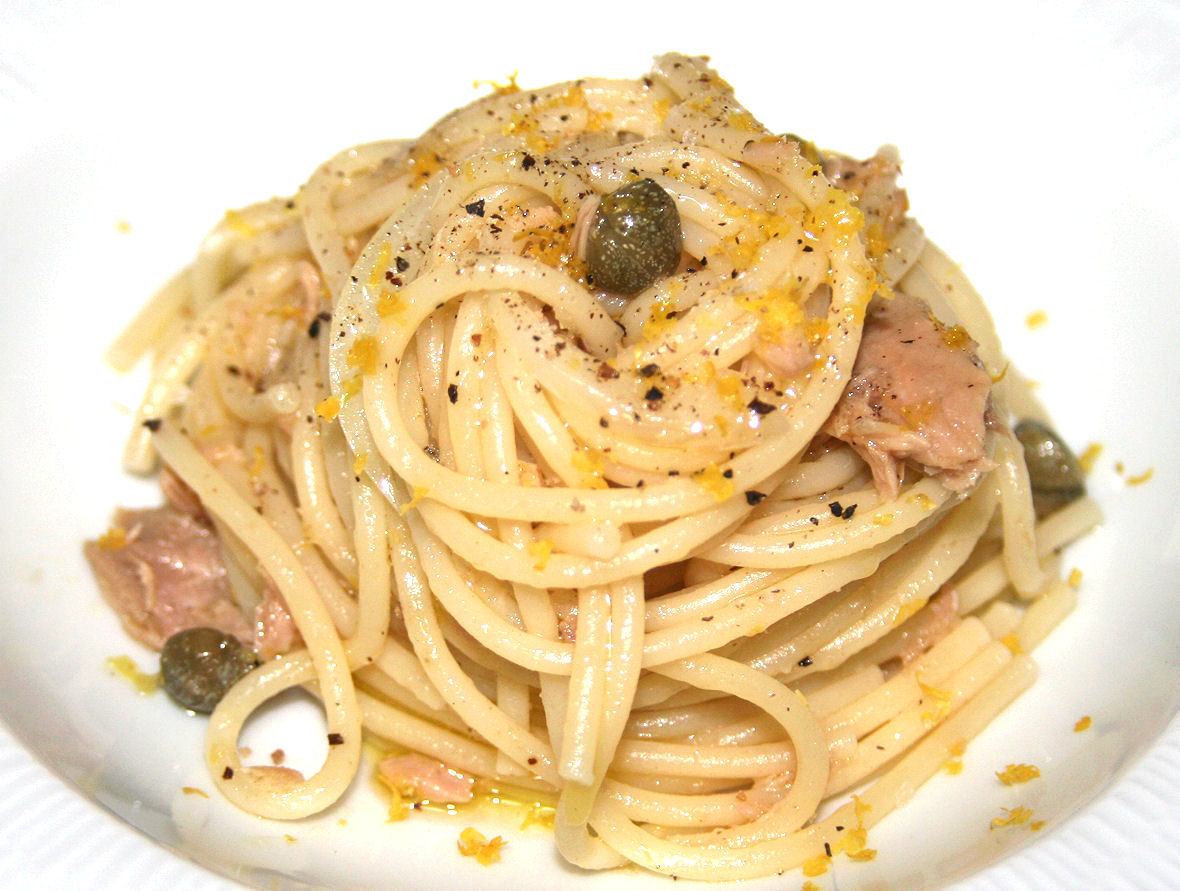 For a light dinner that is quick to prepare, canned tuna tossed with spaghetti is a favorite in Italy. It completes the evening when you crave a satisfying dinner yet do not want to cook for a long time. Classic wheat, wholewheat, farro, or gluten-free spaghetti are equally delicious paired with this sauce.