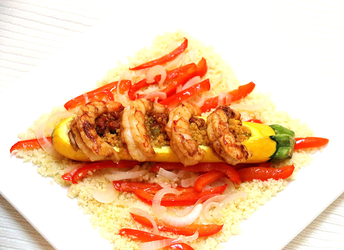Baked summer squash becomes an intriguing Spanish-inspired dish simply by seasoning shrimp with smoked paprika and adding chorizo to the filling. Sweet red peppers and onions accent fluffy couscous as it absorbs flavorful juices.