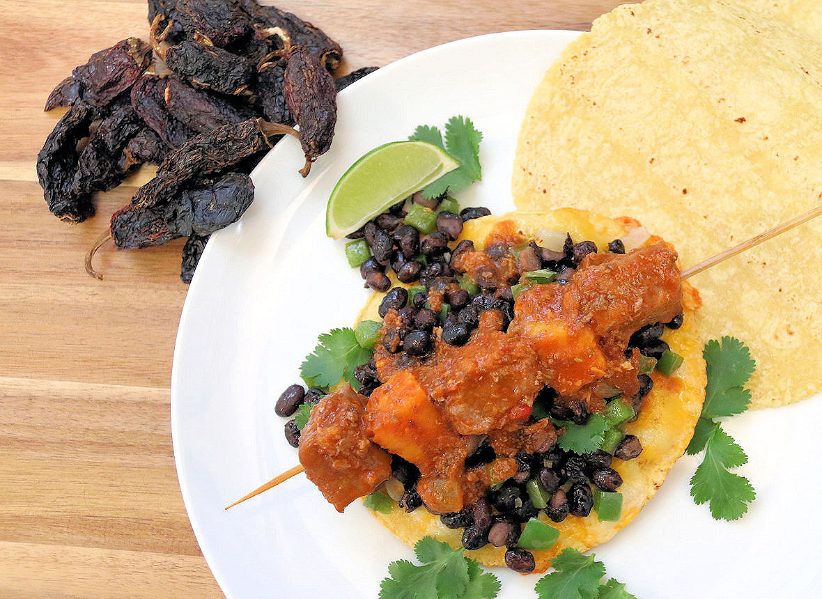 6. Plating: Place cheese tostadas on serving plates. Mound black bean mix on top. Arrange skewer on top. Spoon some sauce from the stew over. Garnish.
