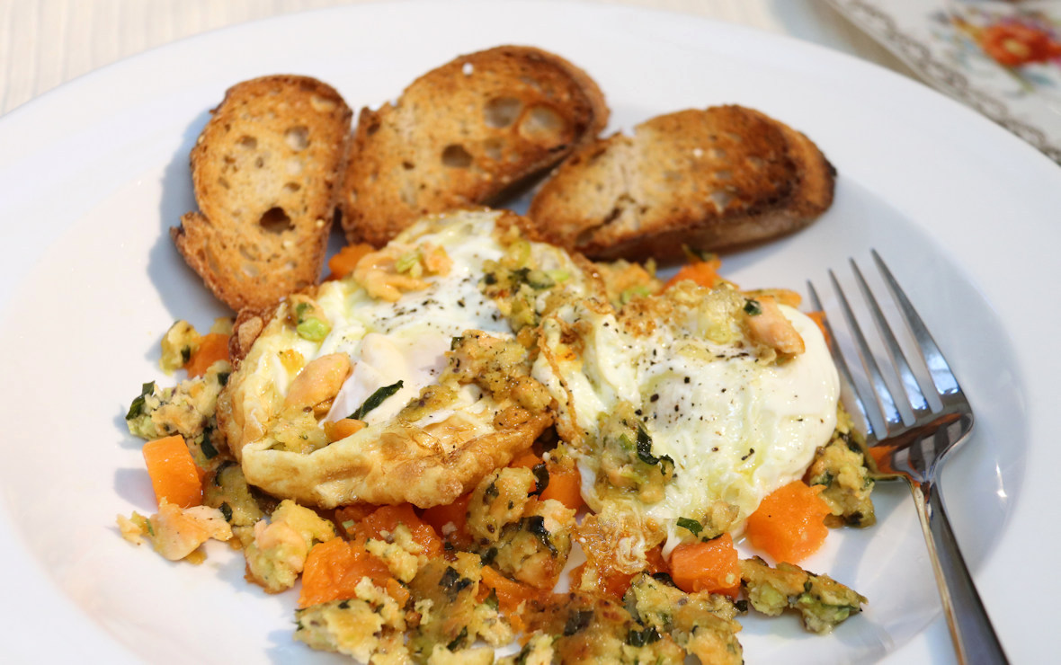 Fried eggs are not just for cooking in the skillet. Make them exceptional by cooking them the way Catalonian chefs do in Barcelona. Salmon Hash with Barcelona-Style Fried Eggs is one of my favorite dishes, so I hope you will like it as much as I do. To make hash with great depth of flavor and cook it quickly without using a lot of oil, cook the potatoes and hard squash in advance. Boil, steam, or roast them first. This way only a small amount of oil is needed for sauteing them and crisping their edges. Salmon hash is fabulous made with fresh salmon filet or steak or even their trimmings, or smoked salmon, or combine fresh and smoked.