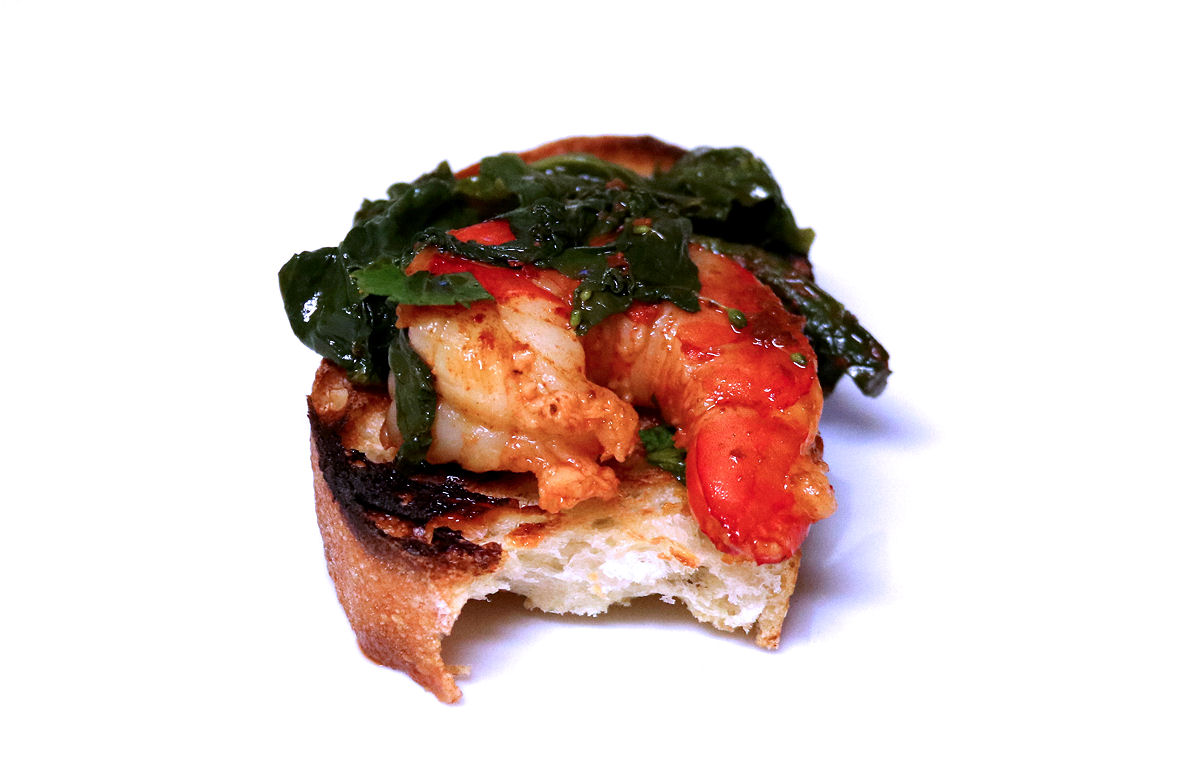 Black Tiger Shrimp are commonly available fresh and frozen. Large in size with firm texture and mild sweet taste, they hold their own against assertive flavors. When cooked, Black Tiger Shrimp remain tender and do not toughen unlike some other shrimp species. Their black stripes turn brilliant red as shown in the photo. Contrasted against the slightly bitter green broccoli rabe and bathed in a garlicky olive oil sauce, they are perfect topped on smoky grilled bruschetta or toast. Serve with Negronis, Manhattans, Sangria, vodka martinis, or iced cold beer.