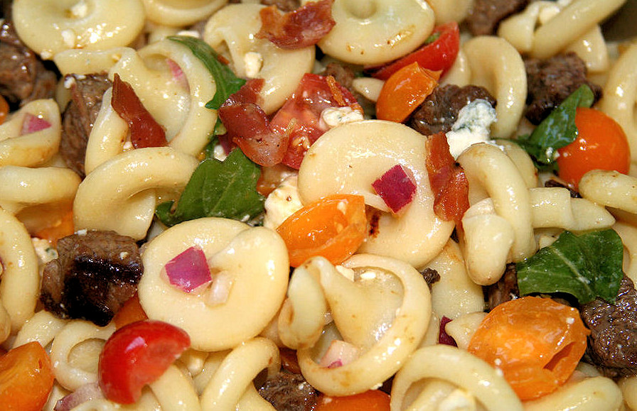 Toss pasta with grilled steak cubes. Add bleu cheese, bacon, and creamy garlic dressing. Pasta for summertime doesn’t need a lot of ingredients to taste great. Just some typical local ingredients such as juicy cherry tomatoes, red onion, and arugula or spinach. The smokiness of the grill combines with the steak's caramelized juices making this pasta a main dish favorite. Men love this combo – Happy Father’s Day or Happy Birthday anyone?