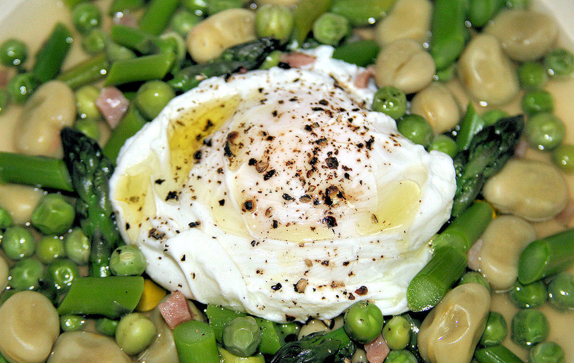 2. Heat a few tablespoons of extra-virgin olive oil in a non-stick pan over low heat. Saute the prosciutto crudo or ham for a minute until fragrant, then add the asparagus, peas, and fava beans. Increase the heat to high, pour in the broth and simmer for 3 to 4 minutes. Season to taste. Turn off the heat and set aside until the eggs are ready to be served.