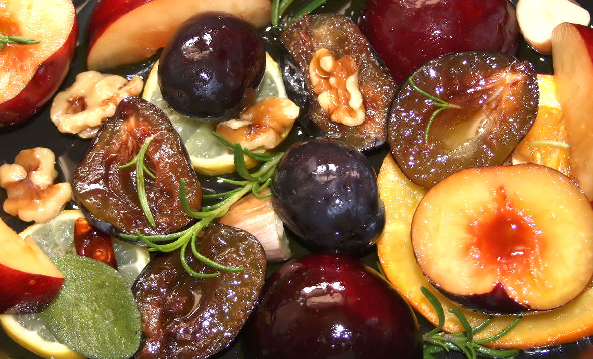 Usually served as a fresh snack or baked into a cake or tart, plums are fantastic when cooked. Have you ever made Roasted Plums at home? It's a winner. Mix all types of plums together…Italian purple plums, cherry-colored Victoria plums, sunshiny Mirabelles, plump Damsons with their blueish-black skins, Greengages, or whatever your market offers. Leave them whole, halved, or quartered. Toss them with crunchy walnuts, garlic and herbs or spices, and olive oil, then tumble the mixture into the roasting dish.