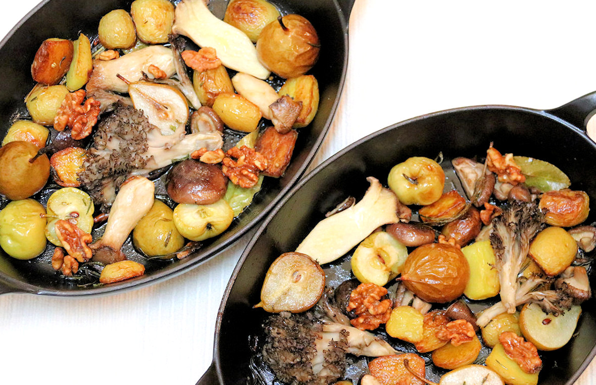 Optional: Just before serving, add drops of walnut oil over the roasted mushrooms, potatoes, pears, and apples. Add the walnuts and other garnishes as you wish. Season with salt and pepper as needed. Serve Roasted Mushrooms, Potatoes, Seckel Pears, and Lady Apples with Walnuts while hot or warm.