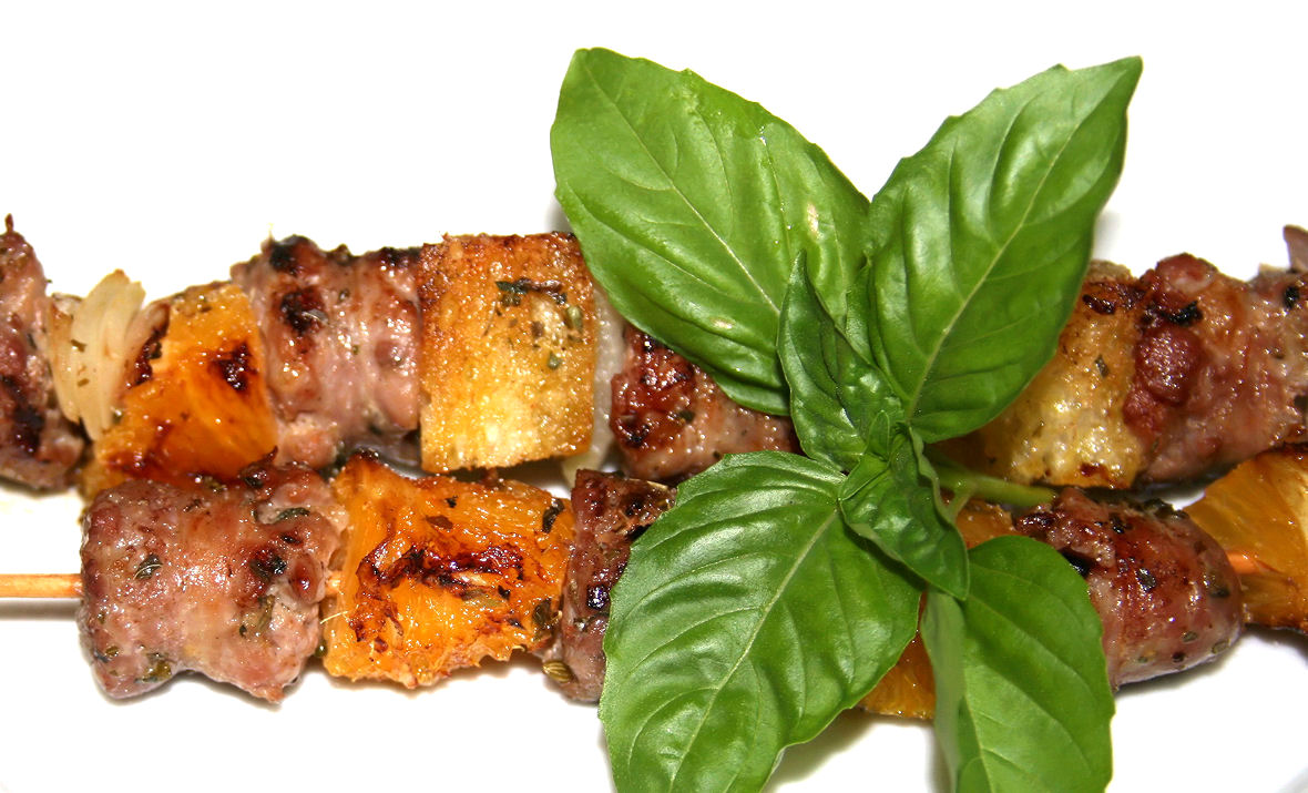 Summer grills usually feature grilled sausage, meat kebobs, hamburgers, and marinated chicken. Perk-up your usual menu with something different. Sicilian skewers of grilled sausage, oranges, onion, and bread is a refreshing change packed with great flavor.