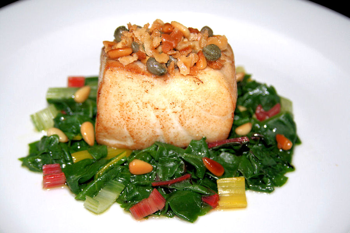 4. Fish: In a non-stick pan, heat the olive oil until very warm. Place the fish filets down and cook on one side for 2 minutes, turn over and cook on the other side for 1 minute. To de-glaze: Turn the heat to high and pour the white wine directly into the pan, do not pour on top of the fish. The wine combines with caramelized juices creating a light sauce. When it sizzles and the wine reduces to a shiny liquid, turn the heat to medium and continue cooking the fish. Depending on thickness of each filet, cook about 4 to 8 minutes for thoroughly cooked through but remaining moist. Arrange the braised greens on the serving plate, nestle the fish filet on top and spoon some topping over. Enjoy.