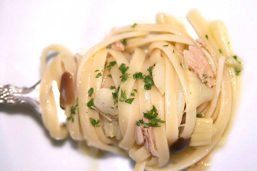 When it's hot outside, prepare this quick no-cook sauce in a few minutes while the pasta is boiling. I’ve used trenette, the favored Genovese cut for pesto sauce, because it adapts so well to no-cook sauces. If you don't have it on-hand, linguini and spaghetti are good substitutes for trenette. Some of the best canned tuna comes from Italy where they process yellow fin tuna and pack it in olive oil in the Mediterranean tradition. Toss the tuna with two popular antipasti – marinated grilled artichoke hearts and olives – to easily create a sauce. Most cooks already have both in their fridge; just serve them in a different way. Best served at room temperature, this pasta dish gives you time to enjoy a glass of wine and a summer breeze before dinner.