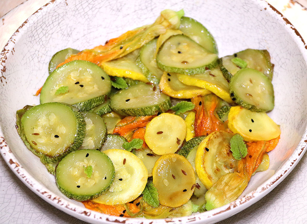 Trim off the ends of the zucchini, cut into thin slices. Over medium heat, warm the oil and melt the butter in a broad pan. Add the garlic and cumin seeds and heat until fragrant. Increase the heat to high, add the sliced zucchini, and salt to taste. Saute for a few minutes on each side until the zucchini softens, keep it moist by adding a spoonful or water or broth as needed. Near the end of sauteing, add the zucchini flowers and kalounji seeds, stir, then turn off the heat. Transfer to a serving bowl and garnish with fresh herbs.